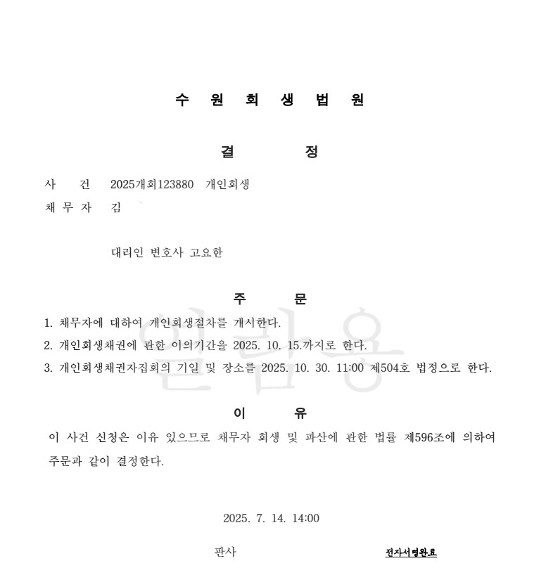 [개시결정] 40대 직장인 여성, 생활비 부족 및 돌려막기로 인한 채무 [변제율14%]